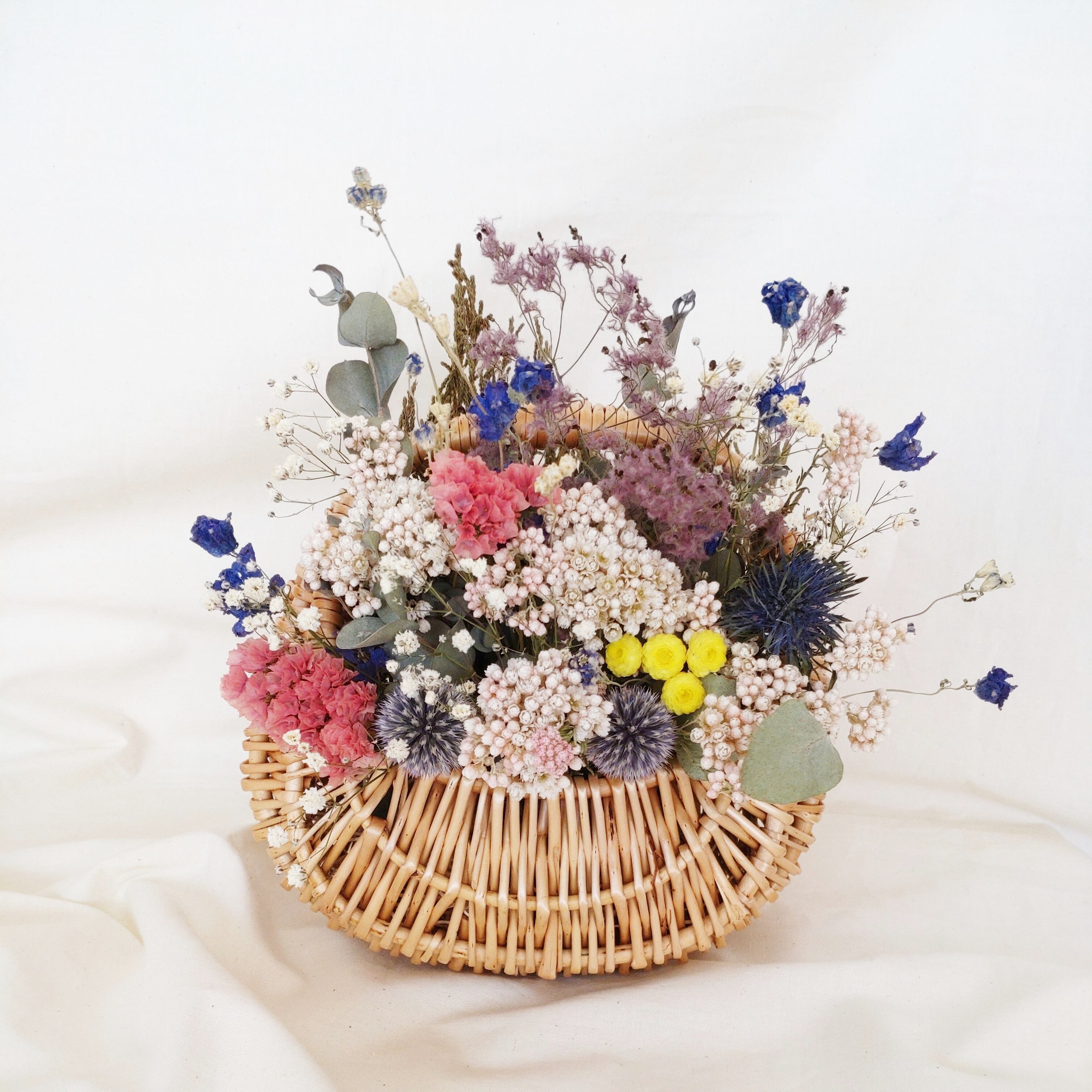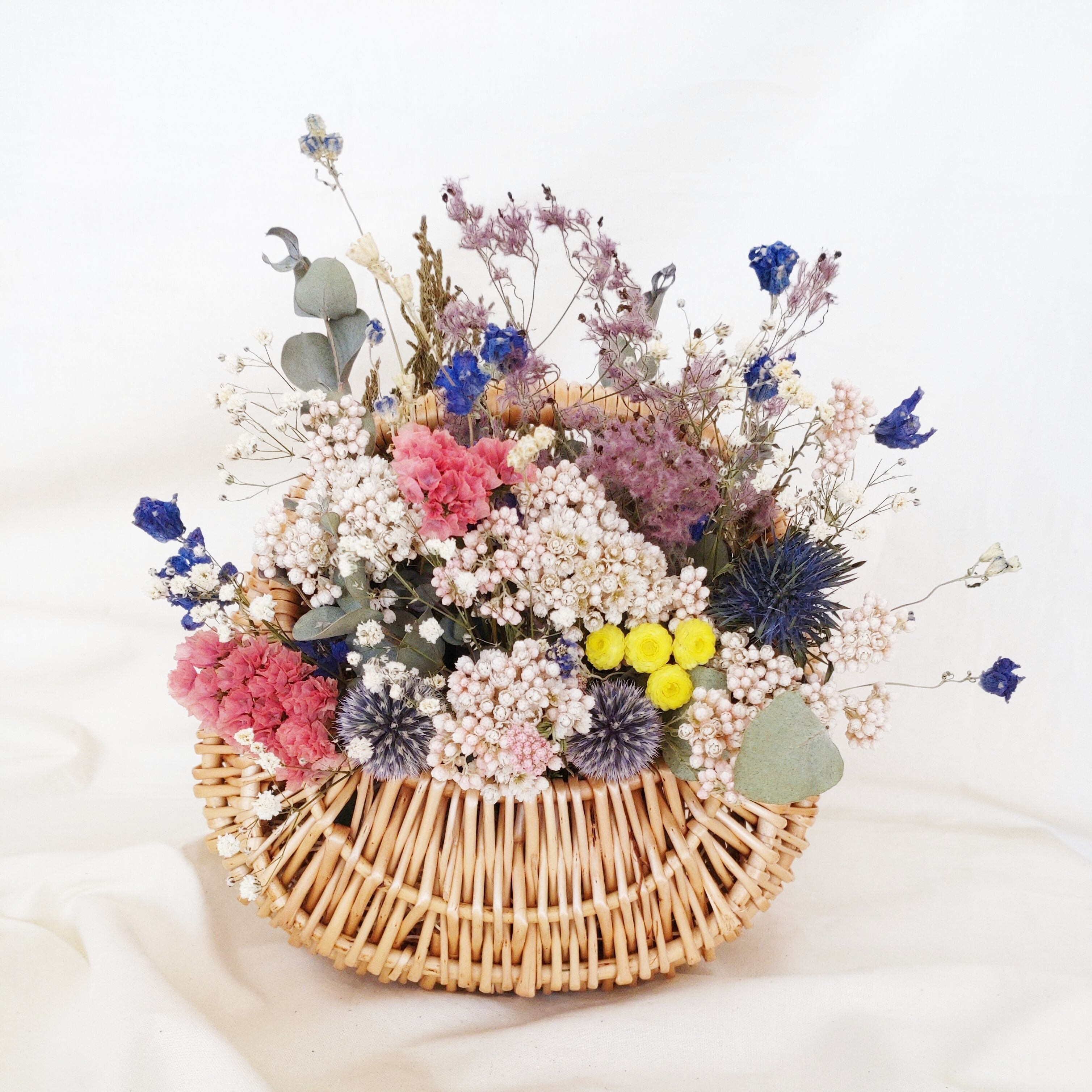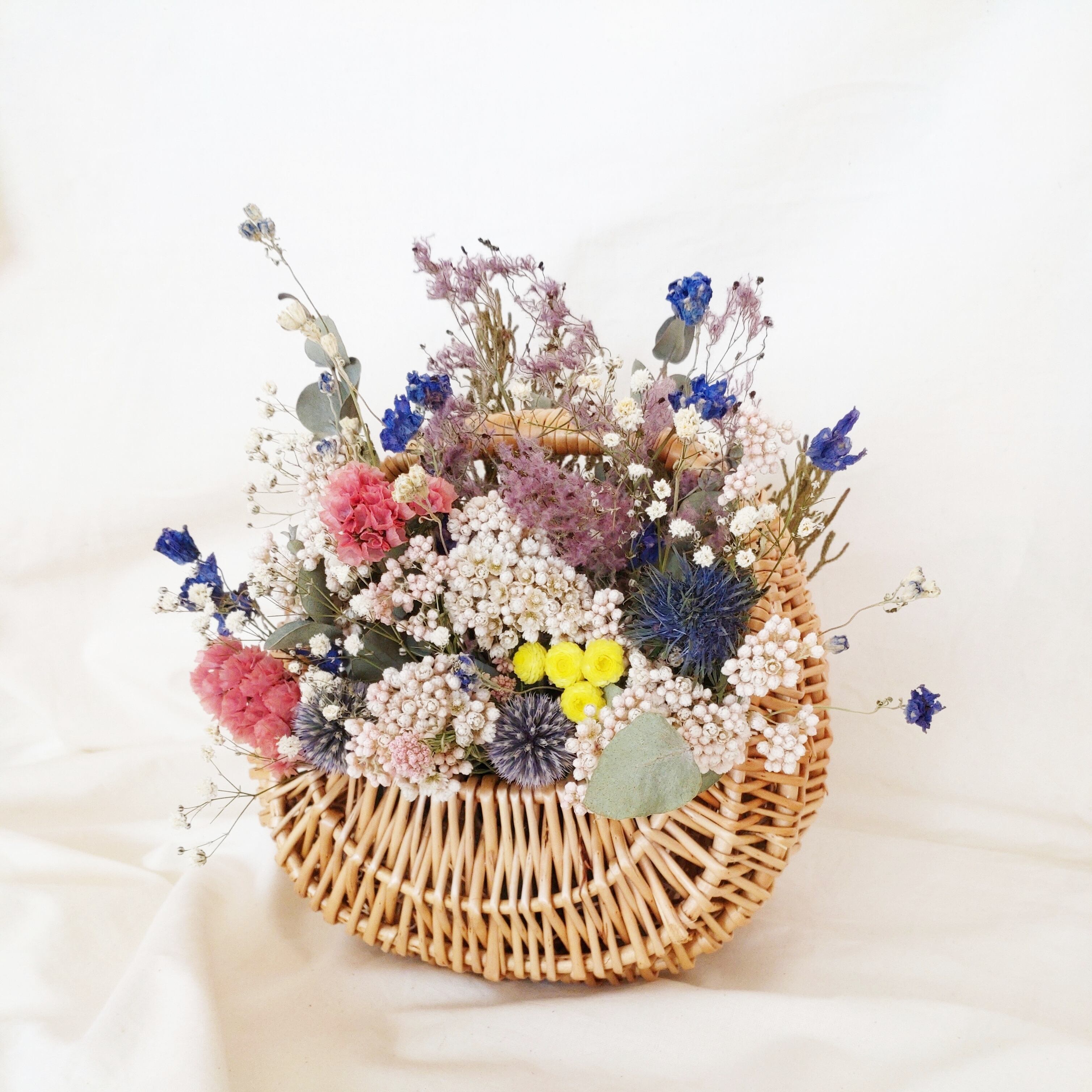 生花を優しくゆっくり自然乾燥させ仕上げたドライフラワーとバスケットのセットです***